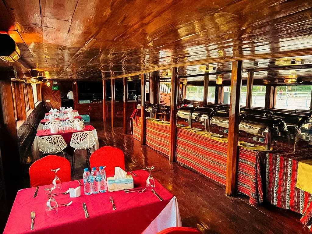 No — it is a traditional wooden dhow with heritage décor.