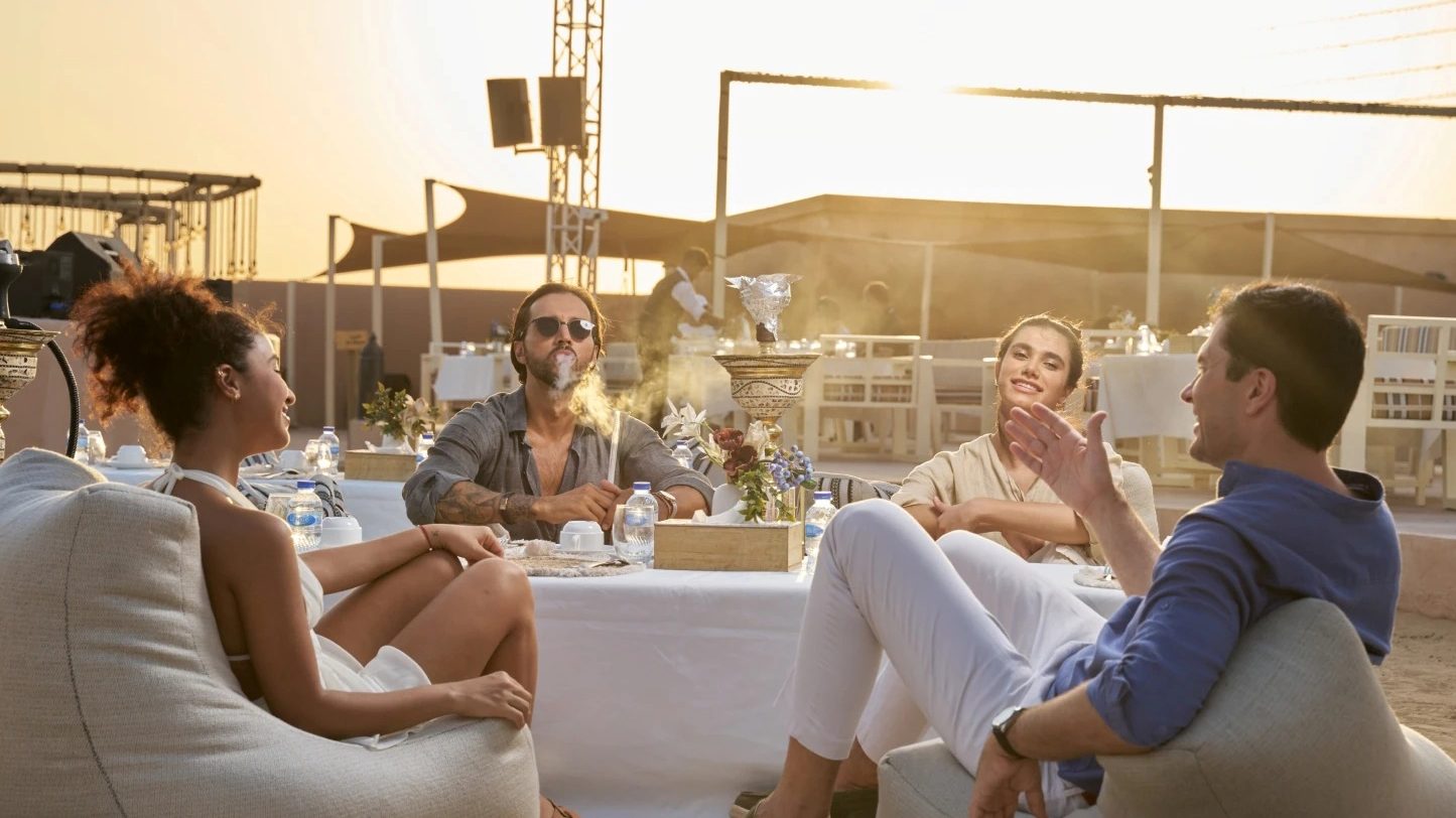 Upon arrival at the Noble Safari Camp, guests are greeted with traditional hospitality. The camp features upgraded seating, enhanced service quality, and a distinctly warm Arabian ambiance. Activities include henna painting, camel rides, sandboarding, shisha in designated areas, and photo opportunities in cultural attire. Guests can relax, explore, and enjoy the peaceful desert surroundings.