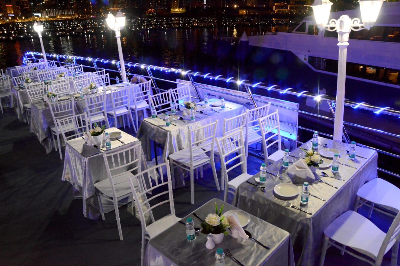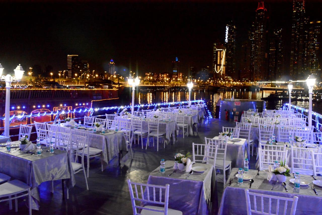On board the Unique Floating Restaurant | Dhow Cruise Dinner Dubai, guests enjoy a delicious dinner, live entertainment, and warm Arabian hospitality. With comfortable seating and panoramic nighttime views, this floating restaurant delivers a memorable evening filled with great food, calm cruising, and beautiful city scenery.