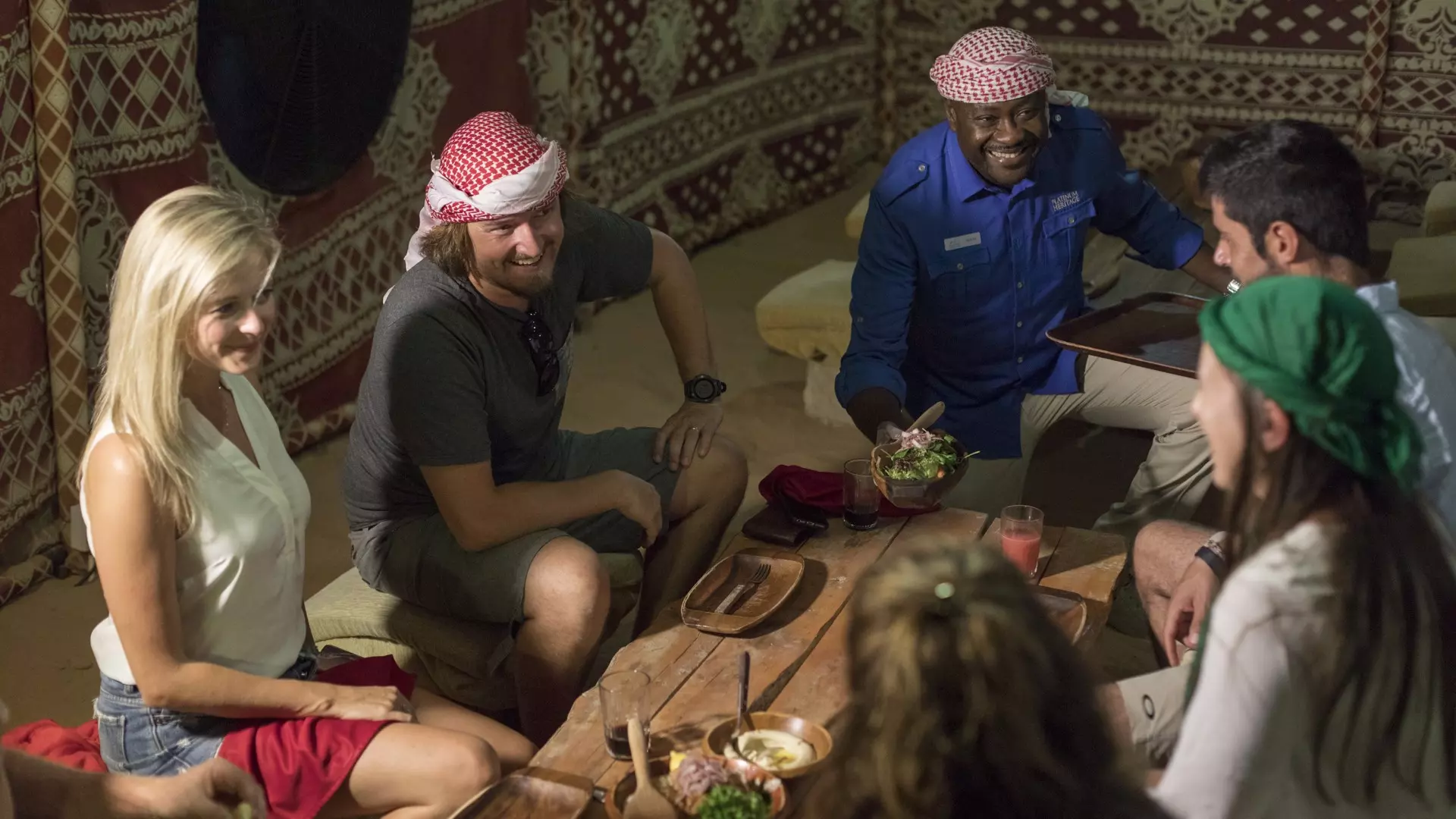 Upon arrival at the Heritage Camp, guests are welcomed into an environment built to reflect traditional Bedouin culture. The camp features cultural décor, classic Arabic seating, and various interactive activities such as henna art, sandboarding, camel riding, and photo opportunities in traditional clothing. The atmosphere is calm, warm, and ideal for families, couples, and first-time visitors.